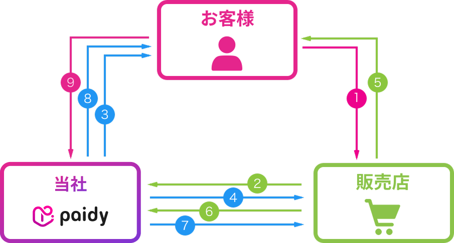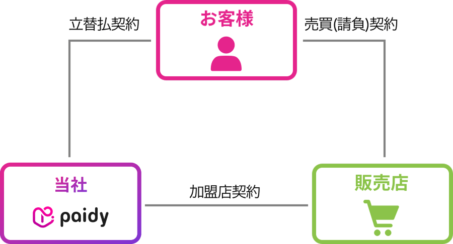 この仕組みは、お客様と販売店の代金決済手段として、現金支払いに代わってクレジット(立替払)制度を利用する場合のものです。Paidy合同会社が、お客様の申込を受けて、これを審査し承認(立替払契約が成立)したときは、当社がお客様の委託により、販売店に立替払いします。